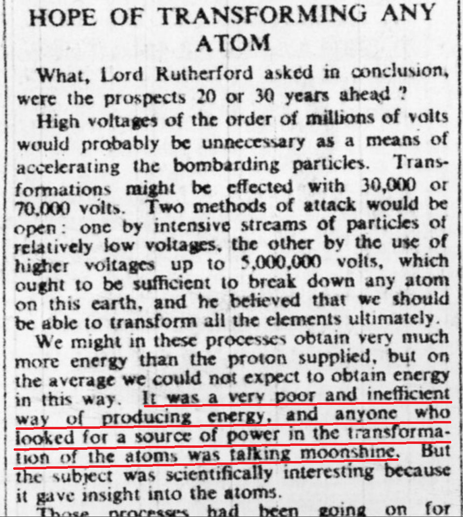 Ο Leo Szilard, ένας Ούγγρος φυσικός που είχε διαφύγει στο Λονδίνο όταν ο Χίτλερ έγινε καγκελάριος της Γερμανίας, διαβάζοντας το παραπάνω άρθρο των Times – χωρίς να επηρεαστεί από το επιστημονικό κύρος του Rutherford – εμπνεύστηκε την αλυσιδωτή πυρηνική αντίδραση με νετρόνια, τα οποία είχαν ανακαλυφθεί το 1932. Ο Szilard υπέβαλε αίτηση για το σχετικό δίπλωμα ευρεσιτεχνίας, το οποίο του χορηγήθηκε το 1936. Και κάπως έτσι ξεκίνησαν οι πυρηνικές βόμβες, αλλά και τα πυρηνικά εργοστάσια παραγωγής ενέργειας, που δεν περνούσαν από το μυαλό της επιστημονικής αυθεντίας του Rutherfond.
