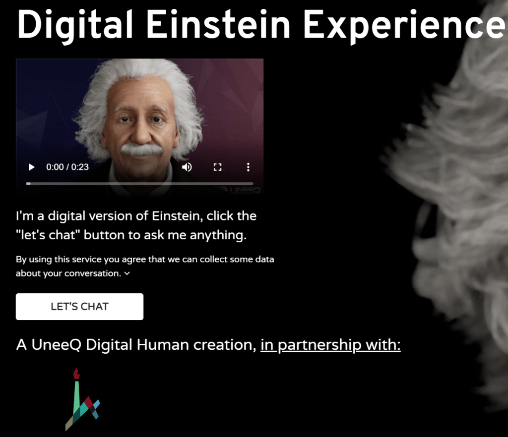 Ένα ψηφιακό αντίγραφο τεχνητής νοημοσύνης του Άλμπερτ Αϊνστάιν συνομιλεί με όσους θέλουν απαντήσεις για την επιστήμη αλλά και την ζωή του. Με αφορμή την συμπλήρωση 100 ετών από την απονομή του Νόμπελ Φυσικής στον κορυφαίο επιστήμονα η εταιρεία UneeQ που εδρεύει στην Νέα Ζηλανδία δημιούργησε τον «Ψηφιακό Αϊνστάιν».