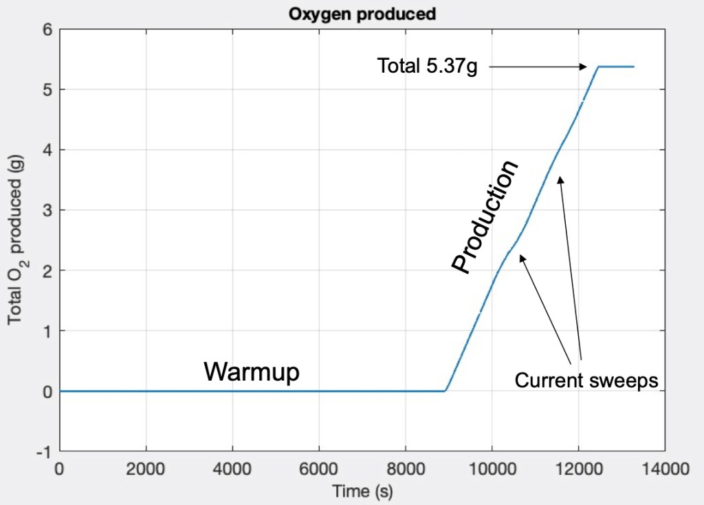 Μετά από δύο ώρες προθέρμανσης το MOXIE άρχισε να παράγει οξυγόνο με έναν ρυθμό 6 γραμμάρια ανά ώρα. Μετά από μια ώρα παρήγαγε 5,4 γραμμάρια οξυγόνου, αρκετά για τις ανάγκες δεκάλεπτης δραστηριότητας ενός αστροναύτη.