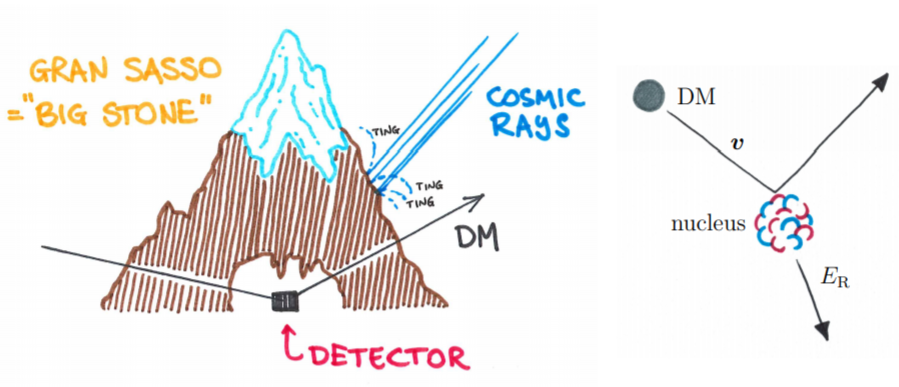 Η άμεση ανίχνευση της σκοτεινής ύλης, βασίζεται στην υπόθεση ότι η σκοτεινή ύλη αλληλεπιδρά και με κάποιον άλλον τρόπο με την συνηθισμένη ύλη, πέραν της βαρυτικής αλληλεπίδρασης. Δυστυχώς, δεν έχουμε αποδείξεις ότι αυτό συμβαίνει στην φύση. Αλλά αν υποθέσουμε ότι η σκοτεινή ύλη μπορεί να αλληλεπιδράσει με την γνωστή ύλη και με άλλον τρόπο πέρα από τη βαρύτητα, τότε οι ανιχνευτές που τοποθετούνται βαθιά κάτω από τη Γη, όπως το πείραμα XENON1T που διεξάγεται στις υπόγειες εγκαταστάσεις του εργαστηρίου Gran Sasso στην Ιταλία, θα μπορούσαν να ανιχνεύσουν τα σωματίδια της σκοτεινής ύλης. Και αυτό μας δείχνει χονδρικά το παραπάνω σχήμα.