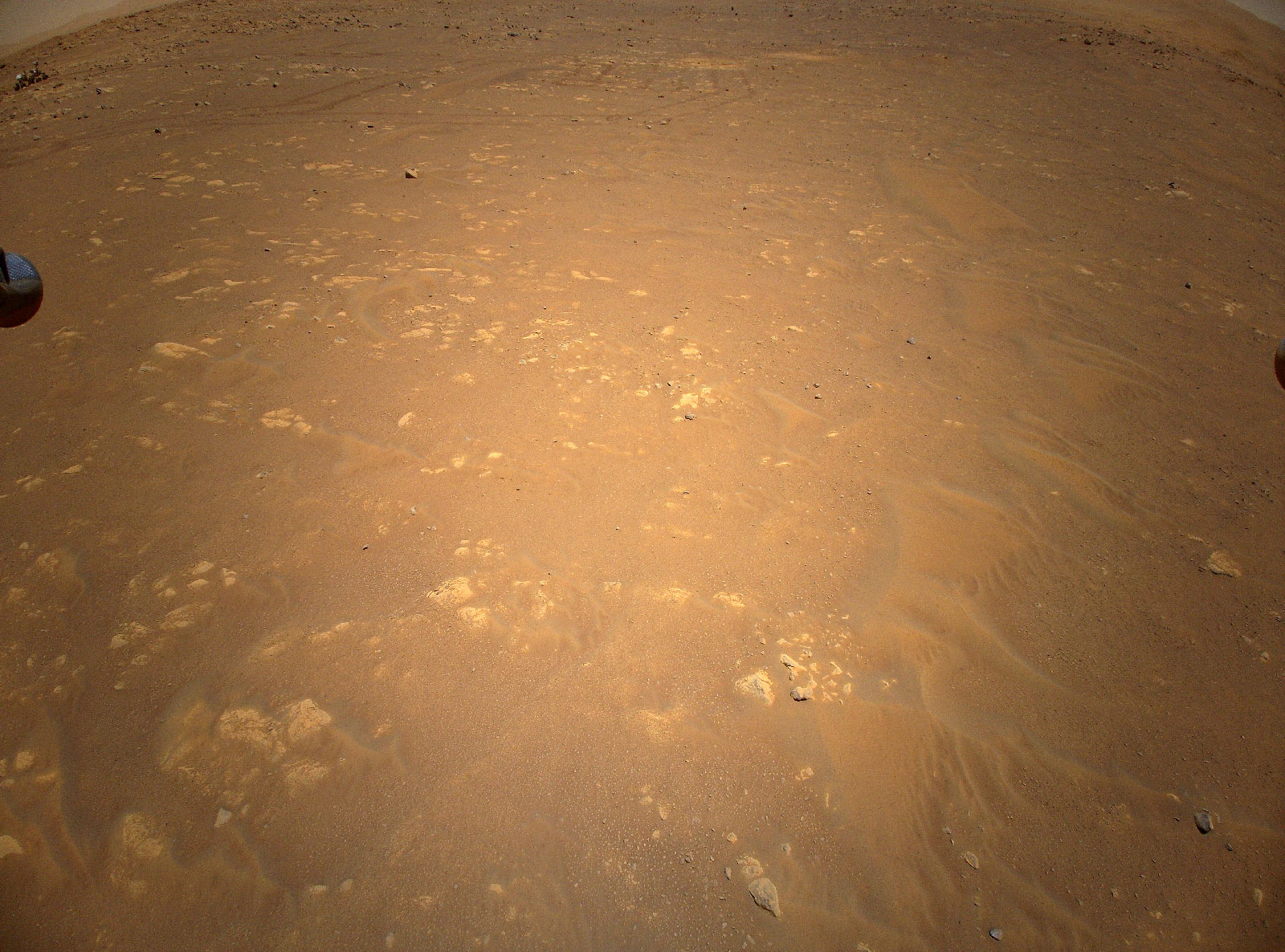 Παρατηρείστε προσεκτικά την πάνω αριστερή γωνία της φωτογραφίας. Θα δείτε το διαστημικό όχημα Perseverance της NASA, όπως το είδε η κάμερα του ελικοπτέρου Ingenuity κατά την τρίτη πτήση του, στις 25 Απριλίου 2021. Το ελικόπτερο πετούσε σε ύψος 5 μέτρων και απείχε περίπου 85 μέτρα από το Perseverance εκείνη τη στιγμή.
