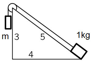 Στο κεκλιμένο επίπεδο του παρακάτω σχήματος, μια μάζα 1kg συνδέεται διαμέσου αβαρούς νήματος με μια άγνωστη μάζα m. Το ορθογώνιο τρίγωνο που σχηματίζεται έχει πλευρές των οποίων τα μήκη είναι ανάλογα με τους αριθμούς 3-4-5. Τριβές δεν υπάρχουν.