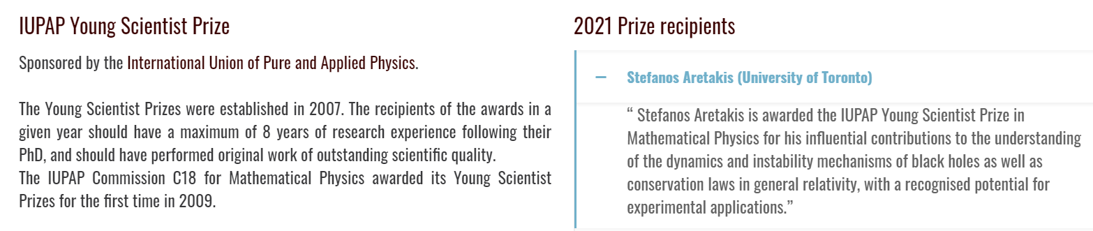 Ταυτόχρονα η IAMP βράβευσε τον Στέφανο Αρετάκη με το Βραβείο Νέου Επιστήμονα IUPAP(International Union of Pure and Applied Physics):