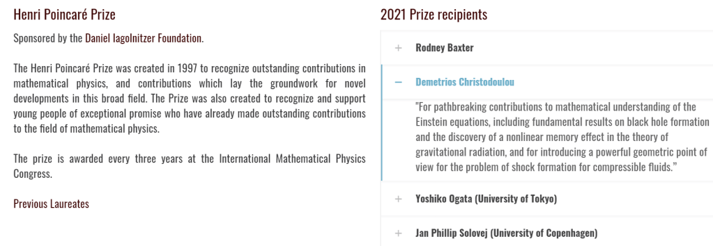Στις 2 Αυγούστου 2021 ο Δημήτριος Χριστοδούλου βραβεύθηκε με το Βραβείο Poincaré από την IAMP (International Association of Mathematical Physics):