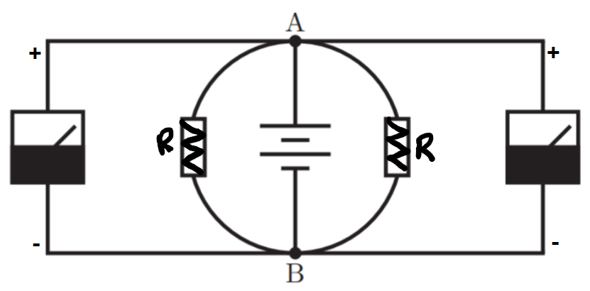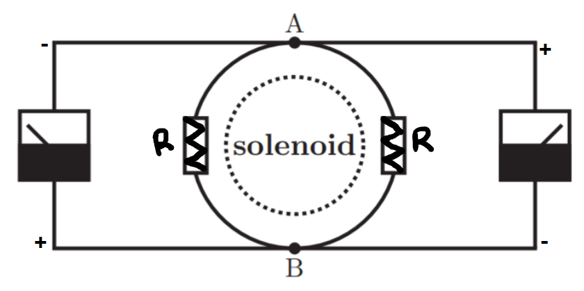 Ο κυκλικός αγωγός με τους δυο ίσους αντιστάτες σε κάθε ημικύκλιο είναι ομόκεντρος με σωληνοειδές απείρου μήκους. Συνδέουμε δυο πανομοιότυπα βολτόμετρα στα σημεία Α και Β, παράλληλα με τους αντιστάτες όπως φαίνεται στο παραπάνω σχήμα. Αν μεταβάλλουμε το ρεύμα που διαρρέει το σωληνοειδές (π.χ. το αυξάνουμε με σταθερό ρυθμό), τότε μεταβάλλεται η μαγνητική ροή που διασχίζει τον κυκλικό αγωγό. Σύμφωνα με το νόμο του Faraday αναπτύσσεται σ’ αυτόν ηλεκτρεγερτική δύναμη και επαγωγικό ρεύμα.