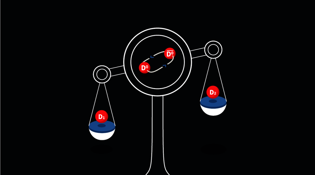 Στον παράξενο κόσμο της κβαντικής φυσικής, όπως o περιβόητoς γάτος του Schrödinger μπορεί να είναι νεκρός και ζωντανός ταυτόχρονα, έτσι και το σωματίδιο D0 μπορεί να είναι ταυτόχρονα ένα μείγμα του εαυτού του και του αντισωματίδίου του. Αυτή η κβαντική «υπέρθεση» οδηγεί σε δύο σωματίδια, το καθένα με την δική του μάζα – ένα ελαφρύτερο και ένα βαρύτερο μεσόνιο D (αναφέρονται ως D1 και D2). Είναι αυτή η υπέρθεση που επιτρέπει το D0 να ταλαντώνεται προς το αντισωματίδιο και αντιστρόφως.