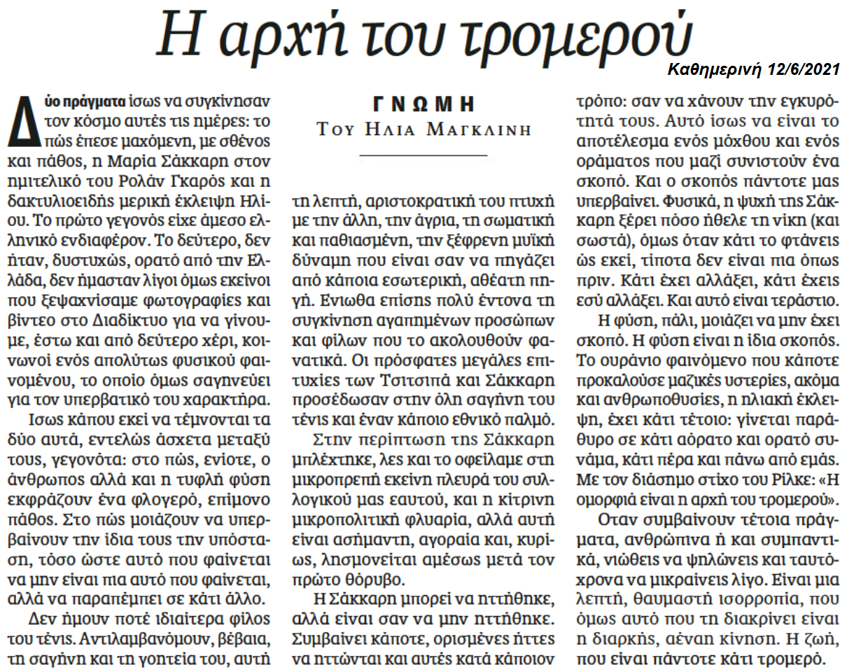 Δύο πράγματα ίσως να συγκίνησαν τον κόσμο αυτές τις ημέρες: το πως έπεσε μαχόμενη, με σθένος και πάθος, η Μαρία Σάκκαρη στον ημιτελικό του Ρολάν Γκαρός και η δακτυολιοειδής μερική έκλειψη Ηλίου…. από το άρθρο του Ηλία Μαγκλίνη με τίτλο «Η αρχή του τρομερού» στην Καθημερινή (12/6/2021):