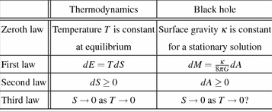 Η Μεγάλη Ιδέα του Stephen Hawking η σύλληψη της οποίας περιγράφεται παραπάνω, σήμερα αναφέρεται ως 2ος νόμος της θερμοδυναμικήςς των μαύρων τρυπών. Σύμφωνα με αυτόν το νόμο, το συνολικό εμβαδόν των μαύρων τρυπών δεν μειώνεται με την πάροδο του χρόνου. Δεδομένου ότι μια μαύρη τρύπα έχει εντροπία ανάλογη με το εμβαδόν του ορίζοντά της, είναι φανερή η αντιστοιχία με τον δεύτερο νόμο της θερμοδυναμικής που μας λέει επίσης ότι η εντροπία του σύμπαντος δεν μειώνεται με την πάροδο του χρόνου.