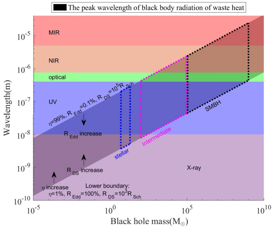 Επιπλέον, αν μια σφαίρα Dyson συλλέγει όχι μόνο την ηλεκτρομαγνητική ακτινοβολία αλλά και άλλους τύπους ενέργειας (π.χ. κινητική ενέργεια) από τους πίδακες, η συνολική συλλεγόμενη ενέργεια θα ήταν περίπου 5 φορές μεγαλύτερη. Λαμβάνοντας υπόψη την εκπομπή από μια σφαίρα Dyson, τα αποτελέσματα της μελέτης δείχνουν ότι μια σφαίρα Dyson γύρω από μια μαύρη τρύπα στον Γαλαξία 10.000 pc μακριά από εμάς (1pc=3,26 έτη φωτός) είναι ανιχνεύσιμη στο υπεριώδες φως (10−400nm), ορατό φως (400−760nm), υπέρυθρη ακτινοβολία (760nm−40μm) ως η επιπλέον ακτινοβολία που αποβάλλεται στο διάστημα χρησιμοποιώντας τηλεσκόπια όπως το Galaxy Evolution Explorer (GALEX). Η ανάλυση των παρατηρούμενων φασματικών κατανομών ενέργειας και η μέτρηση της μεταβλητότητας της ακτινικής ταχύτητας μπορούν να βοηθήσουν τον εντοπισμό αυτών των πιθανές τεχνητών δομών.