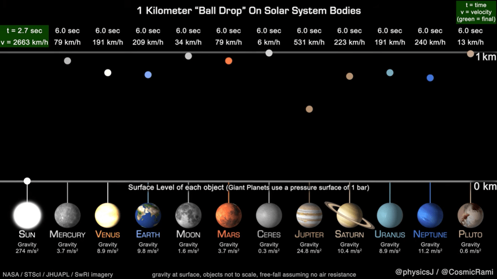 Στο βίντεο που ακολουθεί βλέπουμε μια μπάλα να πέφτει ελεύθερα από ύψος 1000 μέτρων από την επιφάνεια: του Ήλιου, όλων των πλανητών, της Σελήνης, του Πλούτωνα, και του αστεροειδούς Δήμητρα (Ceres), υποθέτοντας ότι δεν υπάρχει αντίσταση στον αέρα.