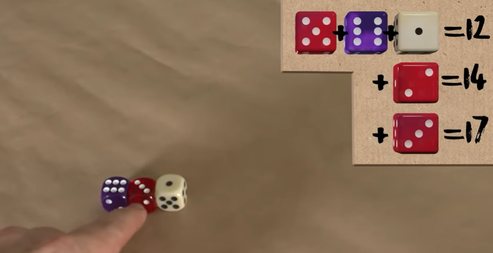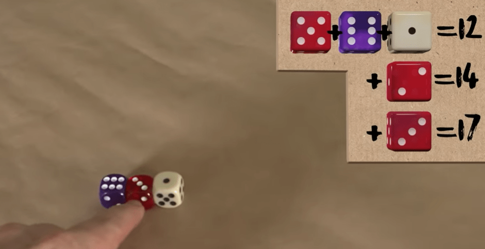 Κλείνουμε τα μάτια μας και ζητάμε από το υποψήφιο θύμα να ρίξει τρία ζάρια. Χωρίς να βλέπουμε του ζητάμε να προσθέσει τα τρία νούμερα που προέκυψαν (π.χ. 5+6+1=12) και να συγκρατήσει τον αριθμό. Στη συνέχεια – πάντα χωρίς να βλέπουμε – του λέμε να επιλέξει ένα οποιοδήποτε από τα τρία ζάρια και να προσθέσει νοερά τον αριθμό από την κάτω πλευρά (π.χ. στο παράδειγμα της εικόνας το θύμα επέλεξε το κόκκινο ζάρι που έδειχνε 5 και πρόσθεσε τον αριθμό 2 που βρίσκεται στην πίσω πλευρά, 12+2=14). Στην συνέχεια του ζητάμε να ρίξει άλλη μια φορά το εν λόγω ζάρι, να προσθέσει τον νέο αριθμό στο προηγούμενο άθροισμα και να συγκρατήσει το τελικό αποτέλεσμα (στην εικόνα το κόκκινο ζάρι μετά την ρίψη δείχνει τον αριθμό 3, οπότε το τελικό άθροισμα είναι 14+3=17). Τα ζάρια θα παραμείνουν ως έχουν στο τραπέζι.