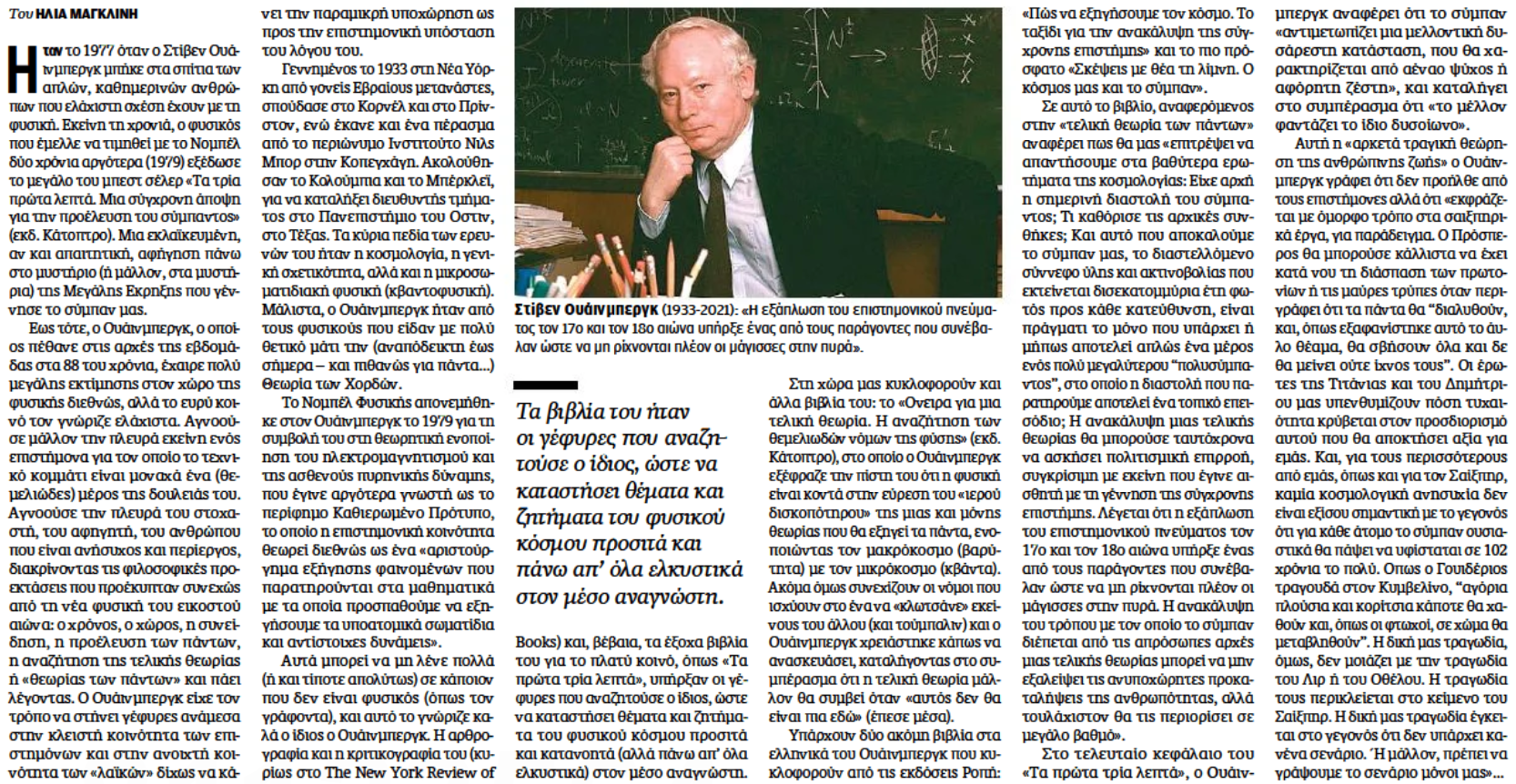 Εως τότε, ο Ουάινμπεργκ, ο οποίος πέθανε στις αρχές της εβδομάδας στα 88 του χρόνια, έχαιρε πολύ μεγάλης εκτίμησης στον χώρο της φυσικής διεθνώς, αλλά το ευρύ κοινό τον γνώριζε ελάχιστα. Αγνοούσε μάλλον την πλευρά εκείνη ενός επιστήμονα για τον οποίο το τεχνικό κομμάτι είναι μοναχά ένα (θεμελιώδες) μέρος της δουλειάς του. Αγνοούσε την πλευρά του στοχαστή, του αφηγητή, του ανθρώπου που είναι ανήσυχος και περίεργος, διακρίνοντας τις φιλοσοφικές προεκτάσεις που προέκυπταν συνεχώς από τη νέα φυσική του εικοστού αιώνα: ο χρόνος, ο χώρος, η συνείδηση, η προέλευση των πάντων, η αναζήτηση της τελικής θεωρίας ή «θεωρίας των πάντων» και πάει λέγοντας. Ο Ουάινμπεργκ είχε τον τρόπο να στήνει γέφυρες ανάμεσα στην κλειστή κοινότητα των επιστημόνων και στην ανοιχτή κοινότητα των «λαϊκών» δίχως να κάνει την παραμικρή υποχώρηση ως προς την επιστημονική υπόσταση του λόγου του.