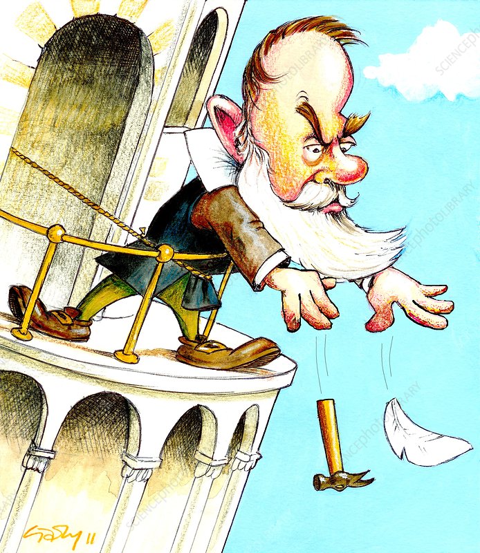 Σύμφωνα με τον μύθο ο Γαλιλαίος, αφήνοντας να πέσουν ελεύθερα διάφορα σώματα από τον Πύργο της Πίζας, απέδειξε πειραματικά ότι σώματα με διαφορετικές μάζες πέφτουν με την ίδια επιτάχυνση: «κάθε σώμα που αφήνεται να πέσει υπό την επίδραση του βάρους του αποκτά ίδια σταθερή επιτάχυνση, ανεξάρτητα της μάζας του, και σε κάθε στιγμή η απόσταση που διανύει είναι ανάλογη του τετραγώνου του παρελθόντος χρόνου».