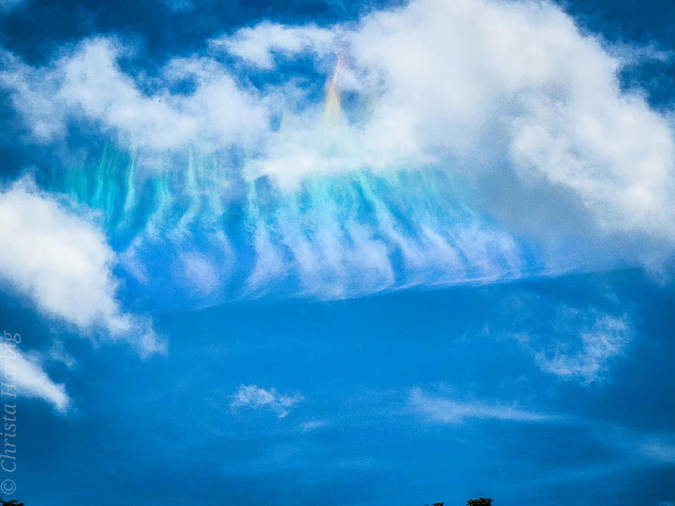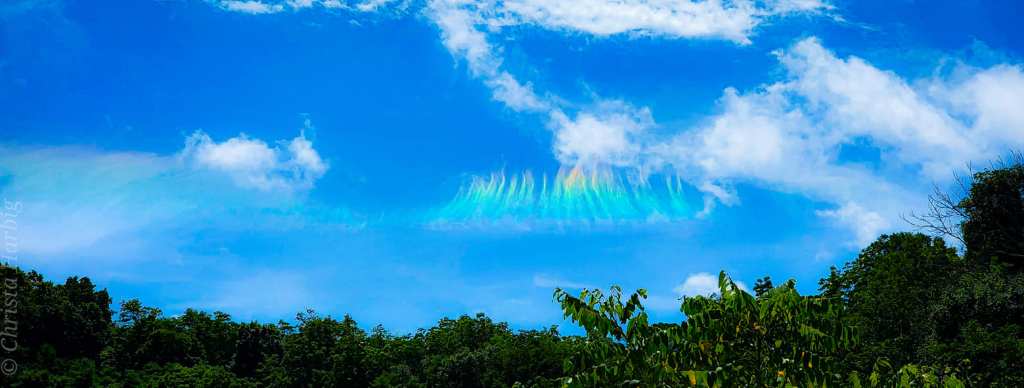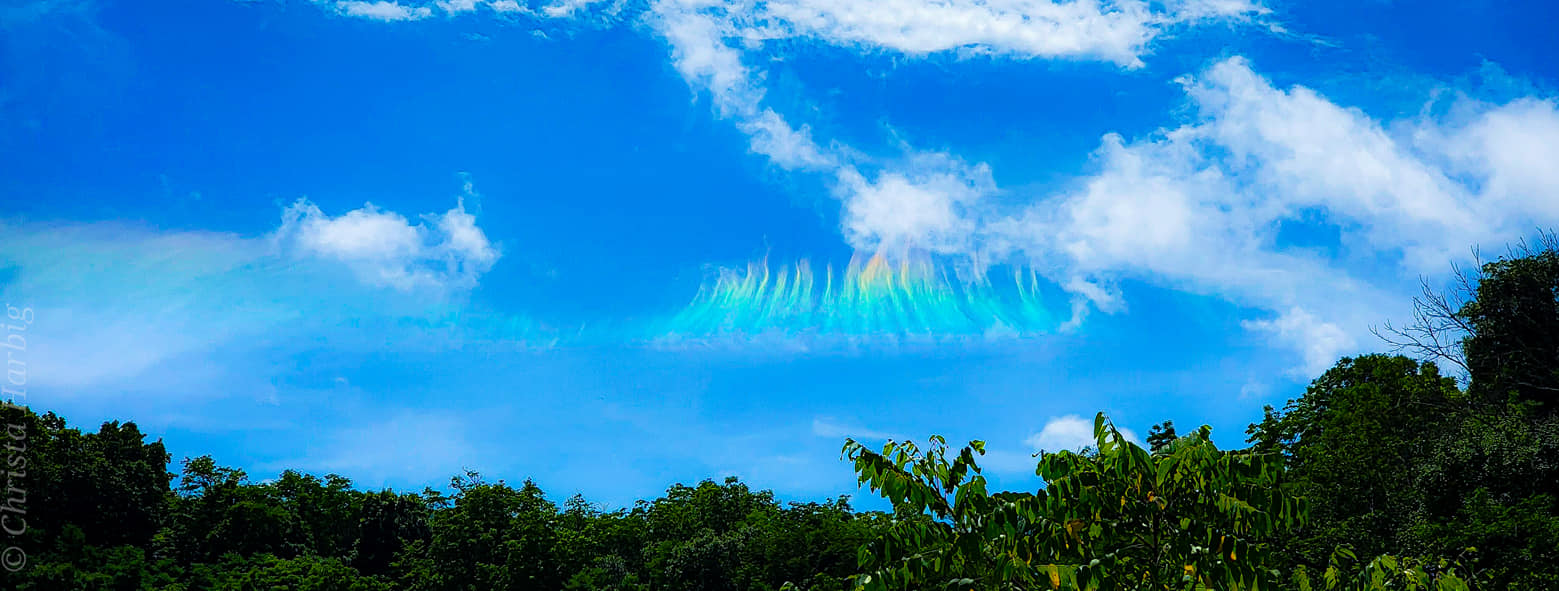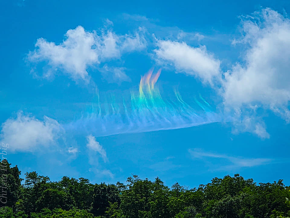 Τι συμβαίνει σ’ αυτό το σύννεφο που ανήκει στην κατηγορία των νεφών που ονομάζονται θύσανοι (Cirrus); Οι θύσανοι σχηματίζονται σε ύψος 8000-12000 μέτρων και αποτελούνται εξ’ ολοκλήρου από παγοκρυστάλλλους. Οι κρύσταλλοι πάγου λειτουργούν σαν αιωρούμενα πρίσματα που δημιουργούν ένα ουράνιο τόξο που μοιάζει με φλόγες πυρκαγιάς. Για να είναι ορατό ένα περιμετρικό ουράνιο τόξο, όπως αυτό της φωτογραφίας, πρέπει ο ήλιος και τα νέφη-θύσανοι να ικανοποιούν ειδικές συνθήκες όσον αφορά τις θέσεις τους.