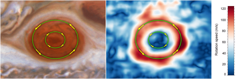 Αναλύοντας τις εικόνες που έλαβε το διαστημικό τηλεσκόπιο Hubble από το 2009 έως το 2020, οι αστρονόμοι διαπίστωσαν ότι η μέση ταχύτητα της θύελλας ακριβώς εντός των ορίων της μεγάλης κόκκινης κηλίδας, που ξεκινά από το εξωτερικό του πράσινου κύκλου (βλέπε παραπάνω σχήμα), αυξήθηκε έως και 8% από το 2009 έως το 2020 και ξεπερνά τα 400 μίλια την ώρα. Αντίθετα, οι άνεμοι κοντά στην εσωτερική περιοχή της καταιγίδας, που ξεκινούν από τον μικρότερο πράσινο δακτύλιο, κινούνται πολύ πιο αργά. Και οι δύο κινούνται αριστερόστροφα.