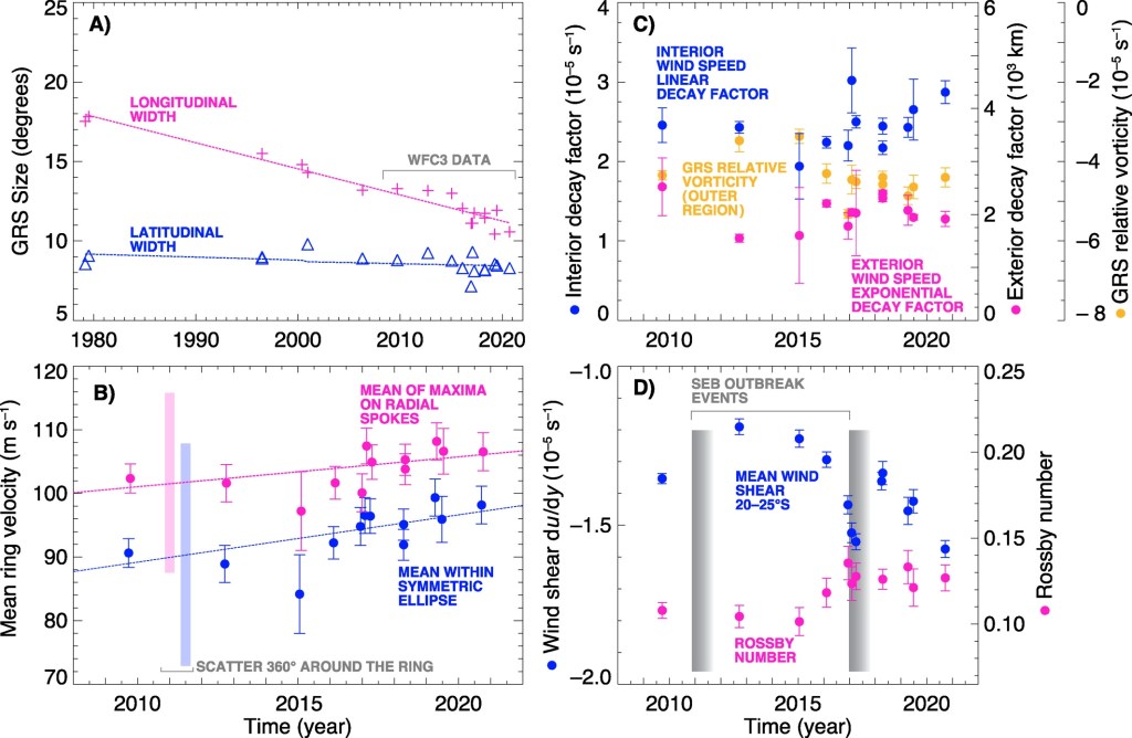 Παλαιότερα το διαστημικό τηλεσκόπιο Hubble είχε παρατηρήσει την συρρίκνωση της μεγάλης ερυθράς κηλίδας του Δία. Τώρα διαπιστώνει ότι αυξάνεται και η ταχύτητα περιστροφής της.