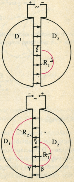 Η κίνηση του σωματιδίου συνεχίζεται και κάθε φορά που αυτό διέρχεται από το διάκενο η ταχύτητα μεγαλώνει, προκαλώντας έτσι αύξηση και στις ακτίνες των κυκλικών τροχιών που διαγράφει μέσα στα ηλεκτρόδια. Οι διαδοχικές επιταχύνσεις του σωματιδίου κάθε φορά που περνάει από το διάκενο, επιτυγχάνονται μόνο αν η ταχύτητά του και η ένταση του ηλεκτρικού πεδίου έχουν την ίδια φορά. Για να συμβαίνει αυτό, θα πρέπει η περίοδος της εναλλασσόμενης τάσης να είναι ίση με την περίοδο της περιστροφής του σωματιδίου, δηλαδή