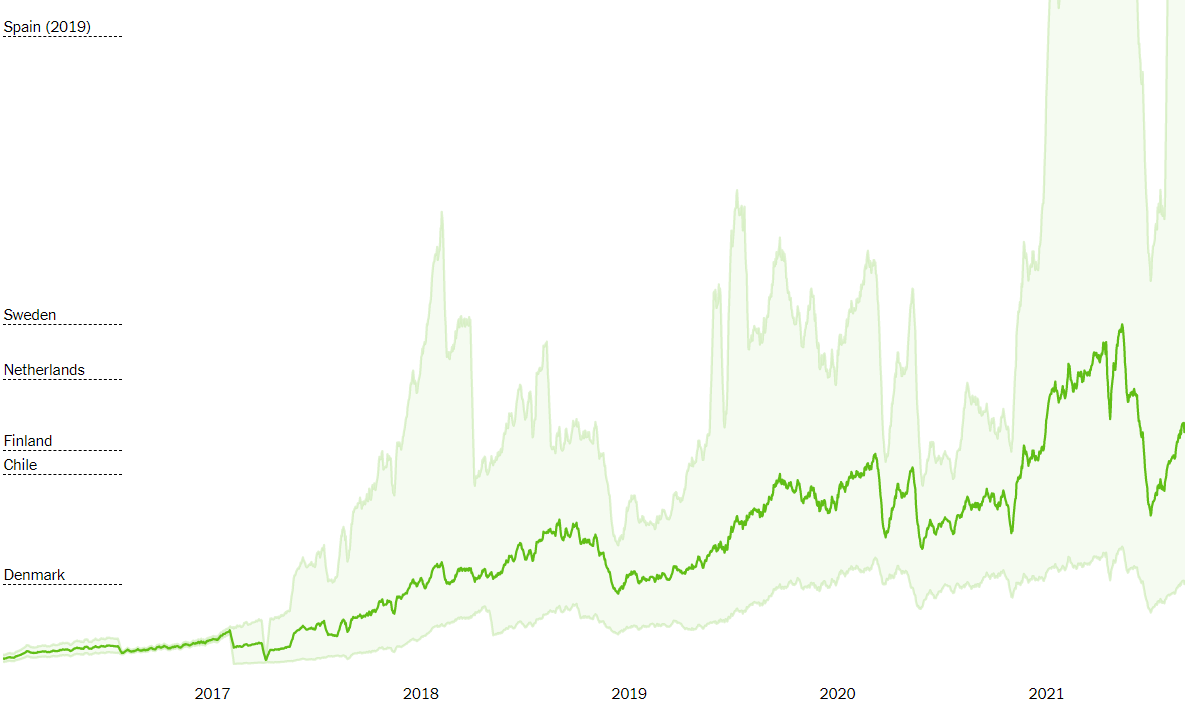 Σύμφωνα με τους ΝΥΤ η διαδικασία δημιουργίας Bitcoin για δαπάνες ή συναλλαγές καταναλώνει περίπου 91 τεραβατώρες ηλεκτρικής ενέργειας ετησίως, περισσότερο από ό, τι χρησιμοποιεί η Φινλανδία, μια χώρα περίπου 5,5 εκατομμυρίων.