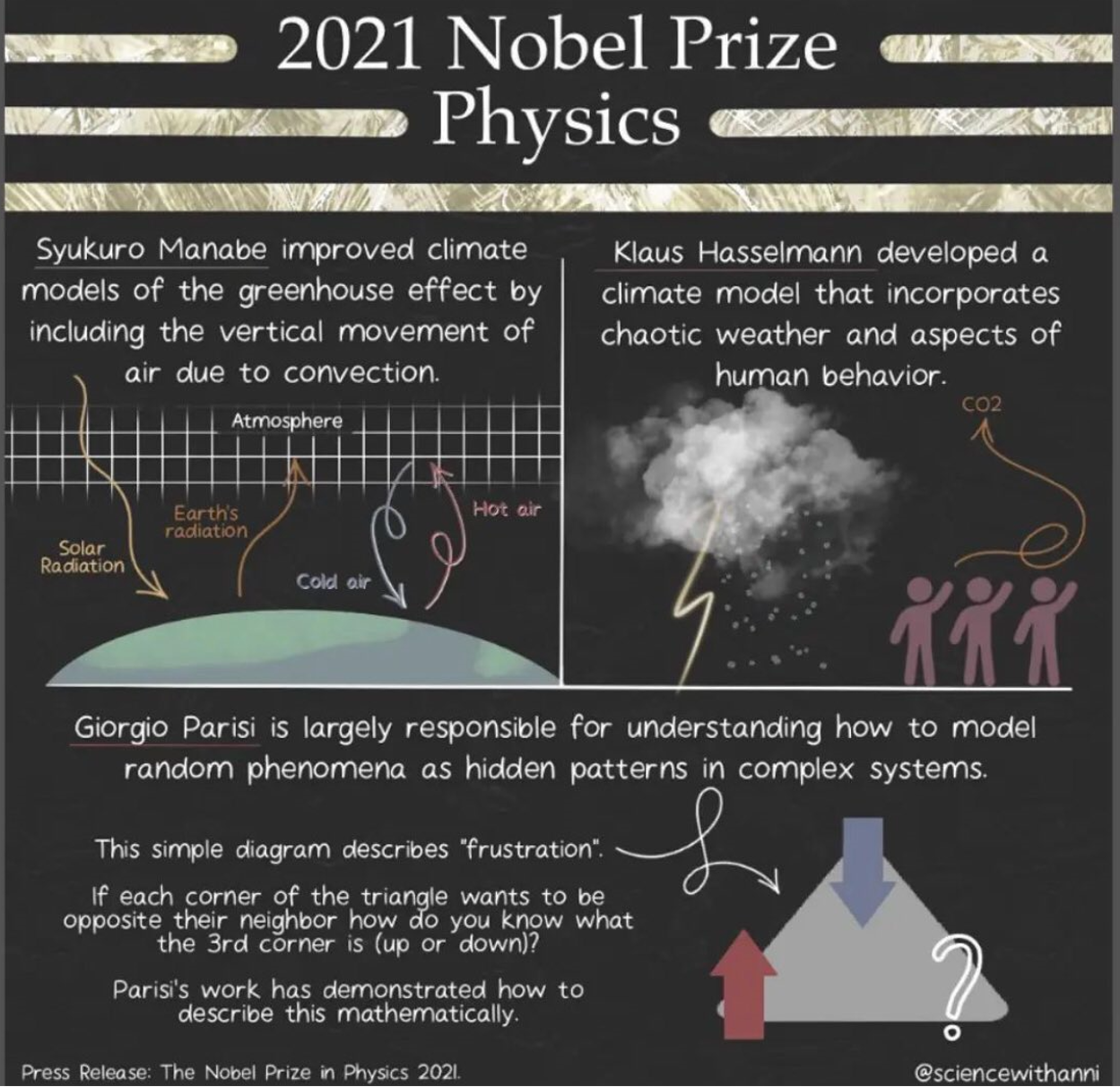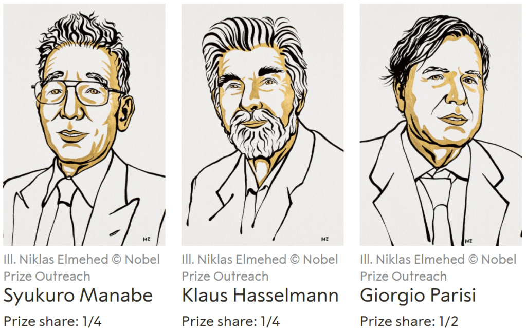 Τo βραβείο Νομπέλ 2021 στην Φυσική απονεμήθηκε στους Syukuro Manabe, Klaus Hasselmann και Giorgio Parisi “για τις πρωτοποριακές συνεισφορές τους στην κατανόηση περίπλοκων φυσικών συστημάτων.”