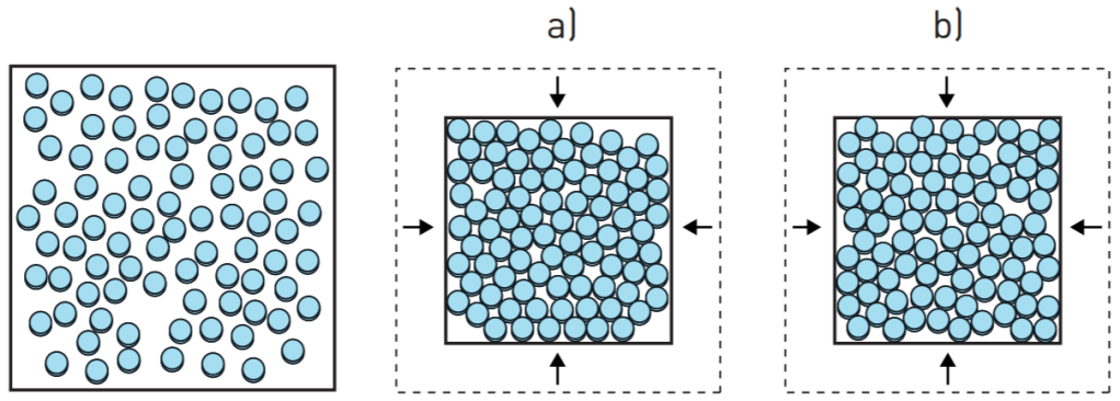 Τα μόρια ενός αερίου μπορούν να θεωρηθούν ως μικροσκοπικές ελαστικές μπάλες, που κινούνται με ταχύτητες που αυξάνονται όταν αυξάνεται η θερμοκρασία. Όταν μειώνεται η θερμοκρασία ή αυξηθεί η πίεση, τα μόρια συμπυκνώνονται πρώτα σε υγρή και στη συνέχεια σε στερεή μορφή. Η στερεά μορφή συνήθως είναι ένας κρύσταλλος, όπου τα σωματίδια είναι διατεταγμένα με μια συμμετρική δομή. Ωστόσο, αν αυτή η μεταβολή συμβεί γρήγορα, τα σωματίδια μπορεί να σχηματίσουν μια ακανόνιστη δομή, η οποία δεν αλλάζει ακόμη και όταν το υγρό ψυχθεί ή συμπιεστεί. Εάν το πείραμα επαναληφθεί, τα σωματίδια θα σχηματίσουν ένα νέο μοτίβο, παρά το γεγονός ότι η μεταβολή πραγματοποιήθηκε με τον ίδιο ακριβώς τρόπο. Γιατί τα αποτελέσματα είναι διαφορετικά;