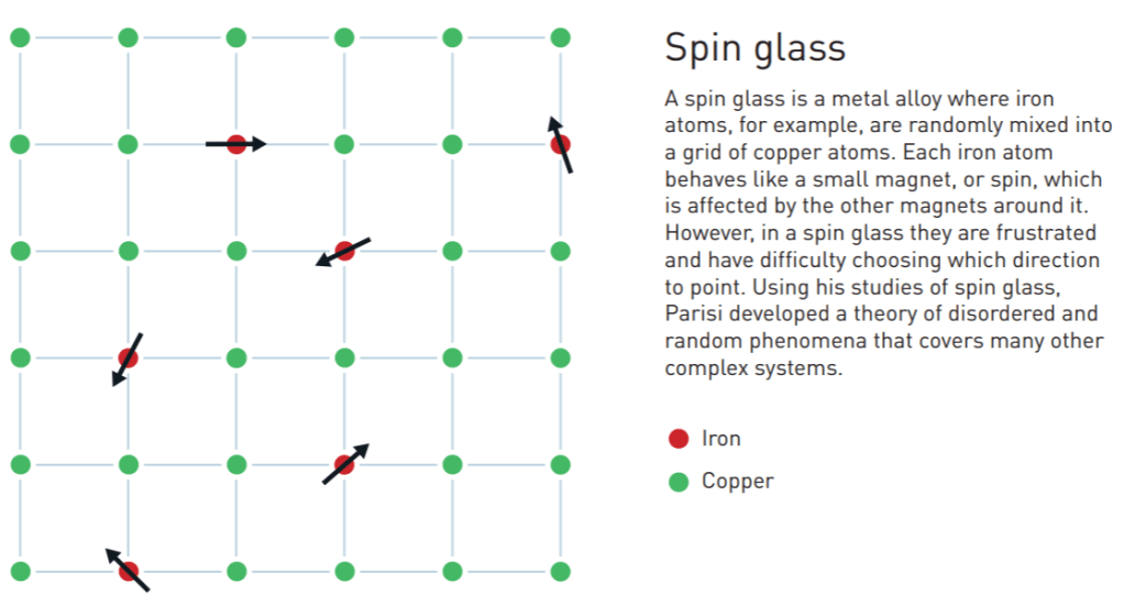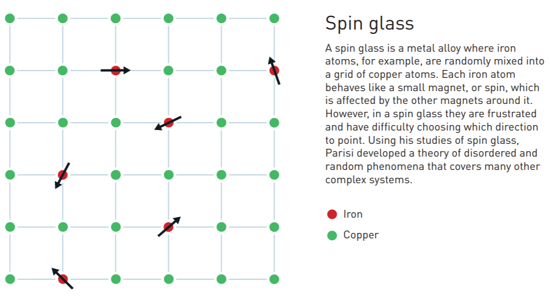 Αυτά τα συμπιεσμένα σφαιρίδια είναι ένα απλό μοντέλο για το συνηθισμένο γυαλί και για κοκκώδη υλικά, όπως η άμμος ή το χαλίκι. Ωστόσο, το θέμα της αρχικής εργασίας του Parisi ήταν ένα διαφορετικό είδος συστήματος που ονομάζεται spin glass – στα ελληνικά συναντάται ως ‘ύαλος σπιν‘. Το όνομα αυτό δόθηκε λόγω του ότι τα σπιν των ατόμων του συστήματος έχουν συμπεριφορά ανάλογη των ”κανονικών” υάλων τα οποία είναι άμορφα και χωρικά παγωμένα. Πρόκειται για έναν ειδικό τύπο κράματος μετάλλου στο οποίο άτομα σιδήρου, για παράδειγμα, αναμιγνύονται τυχαία σε ένα πλέγμα ατόμων χαλκού. Παρόλο που υπάρχουν μόνο λίγα άτομα σιδήρου, αλλάζουν τις μαγνητικές ιδιότητες του υλικού με έναν ριζικό και πολύ μυστηριώδη τρόπο. Κάθε άτομο σιδήρου συμπεριφέρεται σαν ένας μικρός μαγνήτης, που επηρεάζεται από τα άλλα άτομα σιδήρου στην γειτονιά του. Σε έναν συνηθισμένο μαγνήτη, όλες οι ιδιο-περιστροφές (σπιν) δείχνουν προς την ίδια κατεύθυνση, αλλά σε ένα σύστημα υάλου σπιν αυτό αποτυγχάνει. Ορισμένα ζεύγη σπιν προσανατολίζονται προς την ίδια κατεύθυνση και άλλα προς την αντίθετη κατεύθυνση – πώς προκύπτει λοιπόν ένας βέλτιστος προσανατολισμός;