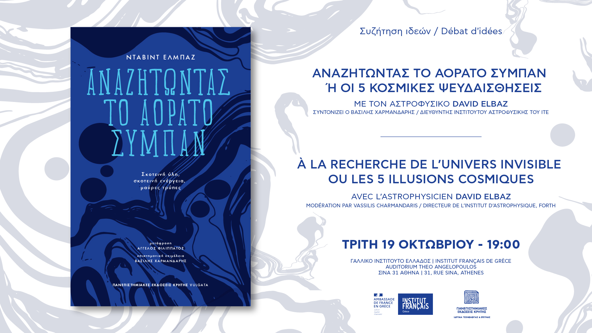O David Elbaz είναι αστροφυσικός στην Επιτροπή Ατομικής Ενέργειας και Εναλλακτικών Μορφών Ενέργειας (CEA) της Γαλλίας, ο David Elbaz διευθύνει το Τμήμα Αστροφυσικής. Είναι επίσης αρχισυντάκτης του επιστημονικού περιοδικού Astronomy & Astrophysics και διετέλεσε επιστημονικός σύμβουλος του Ευρωπαϊκού Οργανισμού Διαστήματος. Το επιστημονικό του έργο επικεντρώνεται στην κατανόηση του αόρατου σύμπαντος. Μελετά το σχηματισμό και την εξέλιξη των γαλαξιών, τις γαλαξιακές μαύρες τρύπες και την επίδραση της σκοτεινής ύλης, ενώ ασχολείται ενεργά με την εκλαΐκευση της επιστήμης μέσα από βιβλία, δρώμενα, ντοκιμαντέρ και διαλέξεις που συγκεντρώνουν πάνω από ένα εκατομμύριο θεάσεις. Μέλος της Ευρωπαϊκής Ακαδημίας Επιστημών (Academia Europaea), βραβεύτηκε για το επιστημονικό του έργο από την Ακαδημία Επιστημών της Γαλλίας (βραβείο Jaffé, 2017) και από την Αμερικανική Αστρονομική Εταιρεία (βραβείο Chrétien, 2000), και συγκαταλέγεται μεταξύ των Highly Cited Researchers (Web of Science, Clarivate Analystics). Διαβάστε άλλο ένα απόσπασμα από το βιβλίο του ΕΔΩ: