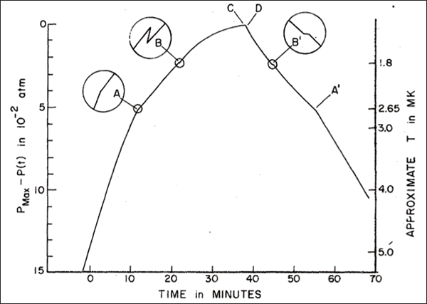 Ο Osheroff διαπίστωσε ότι η γραφική παράσταση της πίεσης κατά την διάρκεια ενός κύκλου ψύξης και θέρμανσης του ηλίου-3 είχε δύο ιδιαίτερα χαρακτηριστικά στο ανέβασμα (Α και Β) και δύο στο κατέβασμα (Α’ και Β’). Αυτές οι διαφοροποιήσεις ήταν μικρές, αλλά ενδεικτικές μιας μετατροπής φάσης. «Και οι τρεις βρεθήκαμε σε κατάσταση ευφορίας γνωρίζοντας ότι βρισκόμασταν στα πρόθυρα μιας σημαντικής ανακάλυψης», έγραψε ο Lee. Ωστόσο, επειδή το κύτταρο περιείχε τόσο υγρό όσο και στερεό ήλιο-3, οι ερευνητές υπέθεσαν ότι η μετάβαση συνέβαινε στο στερεό ήλιο-3 και τον Απρίλιο του 1972, δημοσίευσαν στο περιοδικό Physical Review Letters ένα άρθρο με τίτλο «Evidence for a New Phase of Solid He-3» .