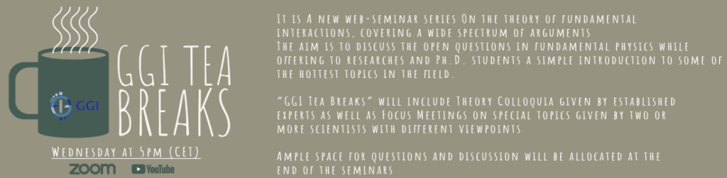 Το GGI Tea Breaks είναι μια νέα σειρά διαδικτυακών σεμιναρίων για την Θεωρία των Θεμελιωδών Αλληλεπιδράσεων, που καλύπτει ένα ευρύ φάσμα θεμάτων. Στόχος είναι να συζητηθούν τα ανοιχτά ερωτήματα της Θεμελιώδους Φυσικής προσφέροντας παράλληλα σε ερευνητές και φοιτητές μια απλή εισαγωγή σε μερικά από τα πιο σημαντικά θέματα του τομέα. Στο βίντεο που ακολουθεί ο Σάββας Δημόπουλος παρουσιάζει την προσωπική του άποψη για όσα μάθαμε μετά από μισό αιώνα θεωρητικών ερευνών πέραν του Καθιερωμένου Προτύπου: