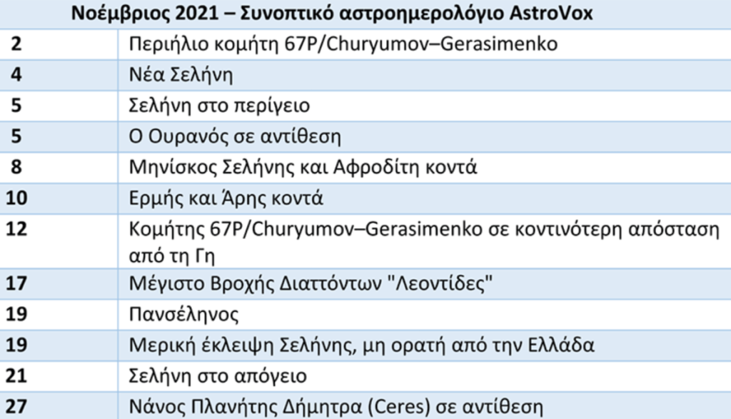 8/11 Μηνίσκος Σελήνης και Αφροδίτη κοντά, 10/11 Ερμής και Άρης κοντά, 12/11 κομήτης 67/P στην κοντινότερη απόσταση από την Γη, 17/11 μέγιστο βροχής διαττόντων «Λεοντίδες» , 19/11 πανσέληνος, 19/11 μερική έκλειψη Σελήνης μη ορατή στην Ελλάδα (astrovox.gr)