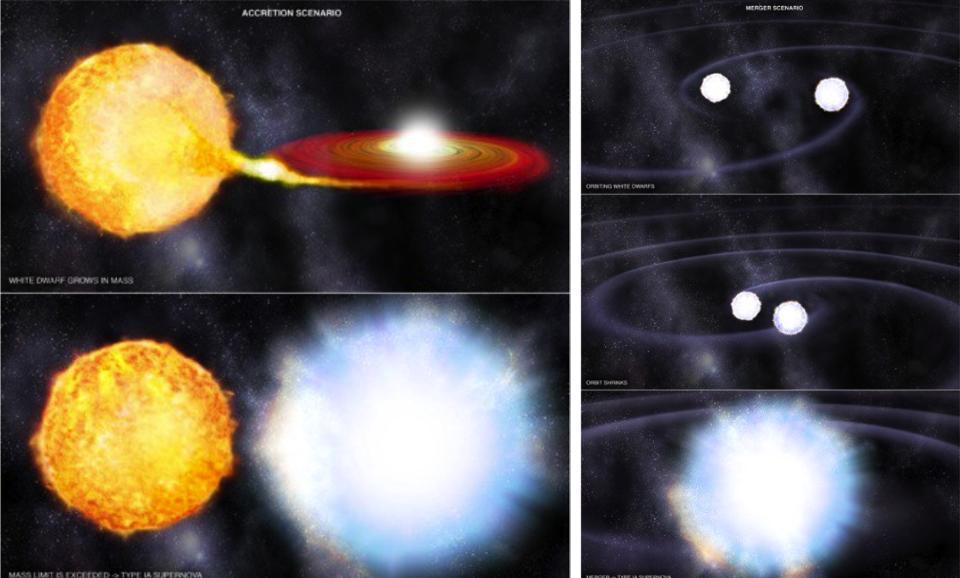 Οι προσαυξήσεις και οι συγχωνεύσεις λευκών νάνων με άλλα άστρα, πυροδοτούν τις εκρήξεις που ονομάζονται σουπερνόβα τύπου Ia. Τότε παράγονται τα στοιχεία από το πυρίτιο (Ζ=14) μέχρι τον ψευδάργυρο (Ζ=30).
