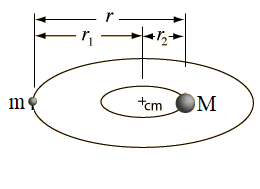 Οι μάζες m και Μ εκτελούν ομαλή κυκλική κίνηση γύρω από το κέντρο μάζας τους με ακτίνες r1 και r2. Για τις ακτίνες ισχύουν , ενώ για την απόσταση των δυο μαζών