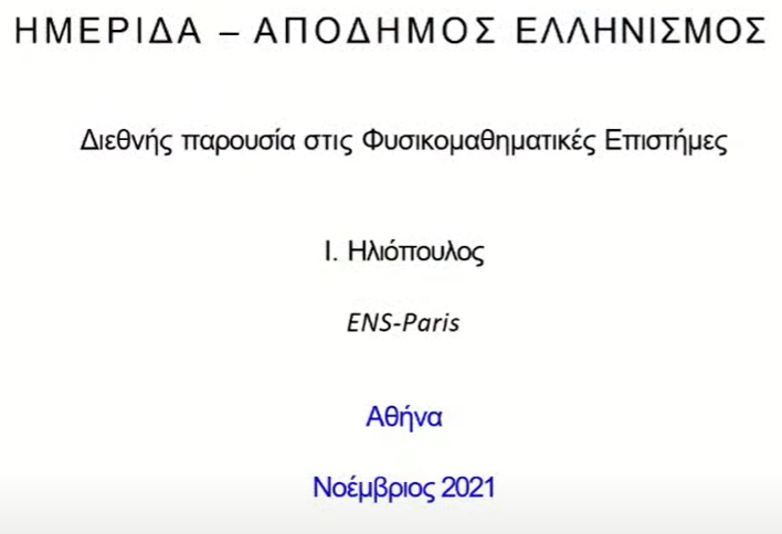 Ακολουθεί η ομιλία του Ιωάννη Ηλιόπουλου (από το 5:20′ και μετά) με τίτλο «Διεθνής Παρουσία στις Φυσικομαθηματικές Επιστήμες»: