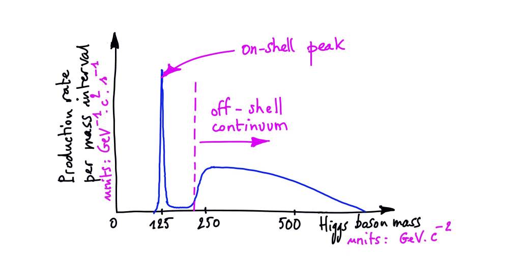 Το μποζόνιο Higgs παράγεται συνήθως με μια μάζα ίση ή κοντά στην ονομαστική της τιμή. Όμως, ένα βραχύβιο σωματίδιο όπως το Higgs μπορεί επίσης να παραχθεί με πολύ μεγαλύτερη μάζα από την ονομαστική τιμή, παρότι οι πιθανότητες να συμβεί αυτό είναι μικρότερες. Αυτό το φαινόμενο – όπως και το πλάτος μάζας του σωματιδίου – είναι μια εκδήλωση της αρχής της αβεβαιότητας του Heisenberg. Μια σύγκριση μεταξύ του ρυθμού παραγωγής αυτών των μποζονίων Higgs μεγάλης μάζας ή «εκτός κελύφους» και του ρυθμού παραγωγής των Higgs με την ονομαστική τους μάζα ή «εντός κελύφους», μπορεί να προκύψει το πλάτος μάζας του μποζονίου Higgs και επομένως ο χρόνος ζωής του.
