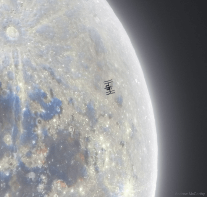 Το παραπάνω στιγμιότυπο ‘συνέλαβε’ ο Andrew McCarthy τον περασμένο μήνα με το τηλεσκόπιό του από την Αριζόνα. Για την ακρίβεια η φωτογραφία προέκυψε από την πολύπλοκη επεξεργασία πολλών εικόνων του βίντεο με την διέλευση του Διεθνούς Διαστημικού Σταθμού (ΔΔΣ) μπροστά από την Σελήνη. Βλέπουμε καθαρά την μορρφή του ΔΔΣ και τον φωτεινό κρατήρα Tycho πάνω αριστερά, καθώς και άλλες λεπτομέρειες στην επιφάνεια της Σελήνης.
