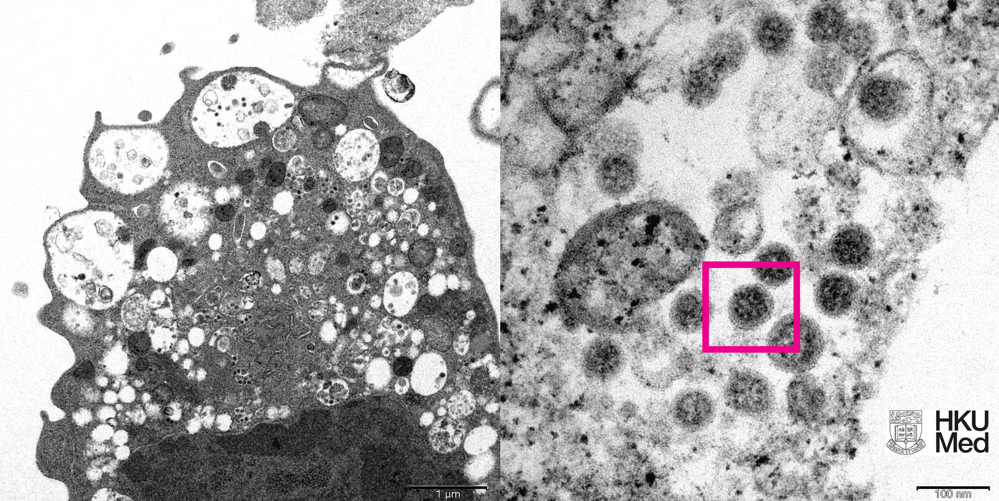 (Δεξιά) Μεγεθυμένη λεπτομέρεια του κυττάρου όπου φαίνονται τα συσσωματώματα ιικών σωματιδίων με τις πρωτεινικές ακίδες σχήματος κορώνας στην επιφάνειά τους (κόκκινο πλαίσιο) – κάντε κλικ πάνω στην εικόνα για μεγέθυνση. Photo credit: Professor John Nicholls, Clinical Professor of Department of Pathology; and Professor Malik Peiris, Tam Wah-Ching Professor in Medical Science and Chair Professor of Virology, School of Public Health, HKUMed; and Electron Microscope Unit, HKU.