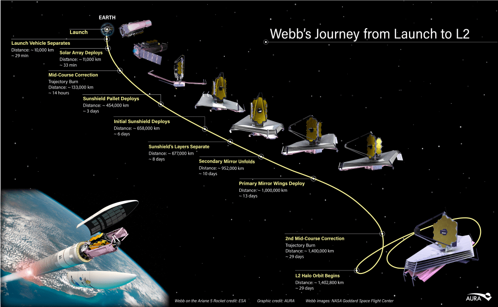 Η εκτόξευση έγινε με έναν ευρωπαϊκό πύραυλο Arian 5, λίγο μετά το μεσημέρι, από το ευρωπαϊκό διαστημοδρόμιο στο Κουρού της Γαλλικής Γουινέας στη βορειοανατολική Νότια Αμερική. Το κόστους 10 δισεκατομμυρίων δολαρίων τηλεσκόπιο θα τεθεί σε τροχιά γύρω από τον Ήλιο στο δεύτερο σημείο Lagrange ή L2, μένοντας σε περίπου σταθερή απόσταση 1,5 εκατομμυρίων χιλιομέτρων από τη Γη ή περίπου τέσσερις φορές πιο μακριά από τη Σελήνη. Συγκριτικά, το διαστημικό τηλεσκόπιο Hubble – που είχε εκτοξευθεί το 1990 – βρίσκεται στο ένα τρίτο αυτής της απόστασης από τον πλανήτη μας (σχεδόν 550 χιλιόμετρα).
