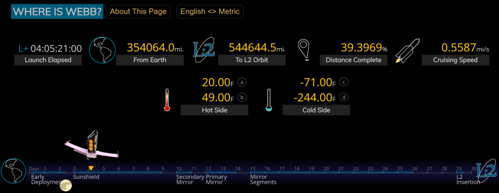 Μπορείτε να παρακολουθείτε τις εξελίξεις σε όλη την διάρκεια της διαδικασίας στον ειδικό ιστότοπο της NASA: webb.nasa.gov/content/webbLaunch/whereIsWebb.html που είναι αφιερωμένος στην αποστολή του διαστημικού τηλεσκοπίου. Στον ιστότοπο αυτόν θα βρίσκουμε όλες τις λεπτομέρειες σχετικά με την θέση, την ταχύτητα, την θερμοκρασία και άλλων χαρακτηριστικών του διαστημικού τηλεσκοπίου. Μέσα σε λίγες μόνο μέρες μετά την εκτόξευσή του, το Webb έχει ήδη καλύψει πάνω από το ένα τρίτο της απόστασης μέχρι την τελική του τροχιά, στο σημείο Lagrange 2 της Γης-Ήλιου.