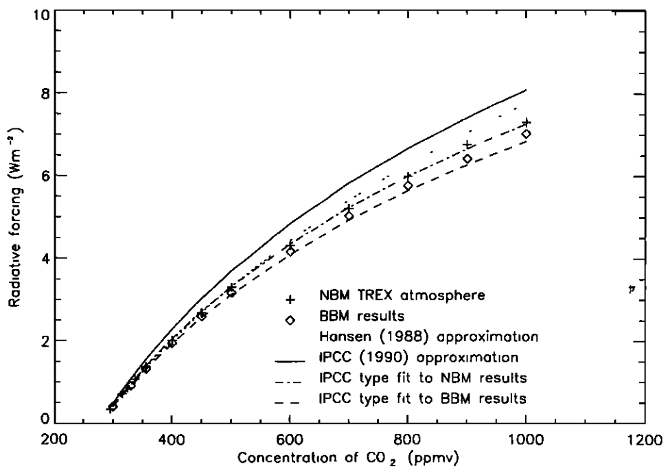 Αν βρούμε μια σχέση που να συνδέει τον εξαναγκασμό (θερμικής) ακτινοβολίας RF που οφείλεται στην αύξηση της συγκέντρωσης του διοξειδίου του άνθρακα στην ατμόσφαιρα, τότε διαμέσου της ΔΤs=RF/λ, προκύπτει αμέσως η απευθείας σύνδεση της συγκέντρωσης CO2 με την μεταβολή της μέσης θερμοκρασίας της Γης. Αλλά αυτό είναι μάλλον δύσκολο να προκύψει αναλυτικά(;).