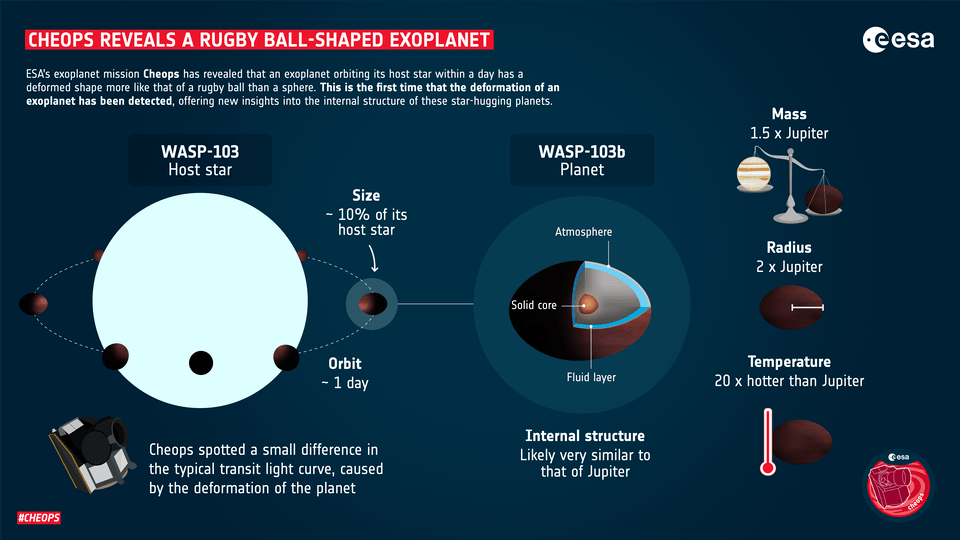 Η είδηση δεν είναι ότι το διαστημικό τηλεσκόπιο της ESA, Cheops, ανακάλυψε έναν ακόμα εξωπλανήτη, τον WASP-103b, αλλά το ότι ο εν λόγω εξωπλανήτης δεν είναι σφαιρικός και μοιάζει με μπάλα του ράγκμπι. Και είναι η πρώτη φορά που εντοπίζεται ένας τέτοιος παραμορφωμένος εξωπλανήτης.