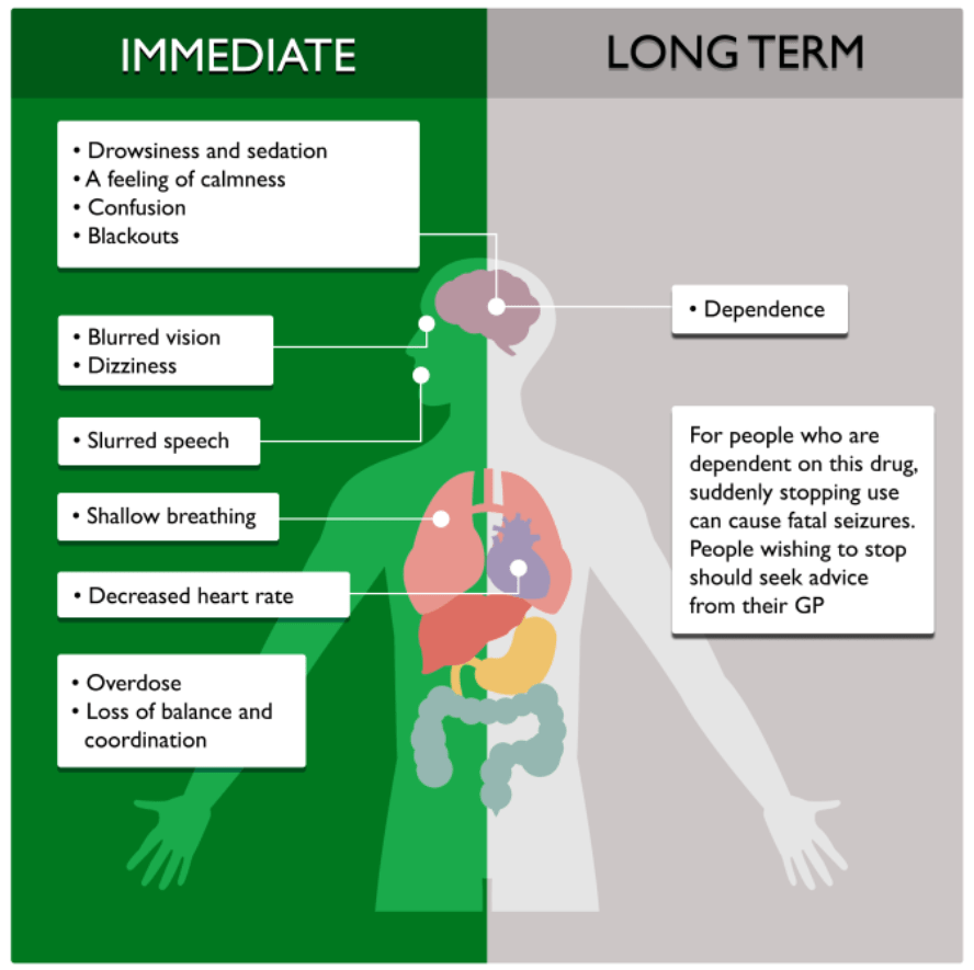 Οι βενζοδιαζεπίνες (BDZs) μπορούν να προκαλέσουν παρόμοια άρση των αναστολών όπως αυτή που προκαλεί το αλκοόλ. Αν και θεωρούνται υπνωτικά, μπορούν απλά να επιφέρουν νάρκωση ή καταστολή όταν δοθούν σε μικρότερη δόση.. Όταν εχεις πάρει BDZs αισθάνεσαι ότι έχεις μεθύσει.. χωρίς.