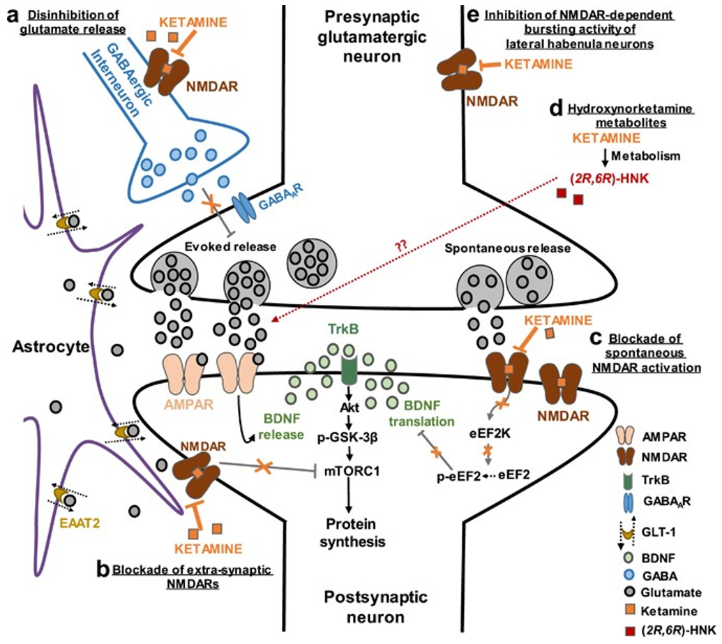 Η κεταμίνη δρα εντελώς διαφορετικά φαρμακολογικά στο νευρικό σύστημα από τα προηγούμενα φάρμακα. Ουσιαστικά μπλοκάρει τη δράση μιας σημαντικής διεγερτικής ουσίας του νευρικού συστήματος, της γλουταμάτης. Άρα προκαλεί καταστολή, χωρίς να προωθεί τη δράση του GABA όπως τα άλλα.