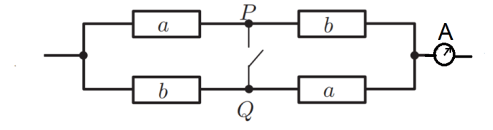 H ολική αντίσταση θα είναι R=(α+b)/2. Στη συνέχεια συνδέουμε τα σημεία P και Q του κυκλώματος κλείνοντας τον διακόπτη. Παρατηρούμε ότι το αμπερόμετρο δείχνει πως το ηλεκτρικό ρεύμα αυξήθηκε. Αυτό σημαίνει πως η νέα ολική αντίσταση του κυκλώματος μειώθηκε(*): R’=2αb/(α+b)≤R=(α+b)/2 (στην περίπτωση που α=b η ολική αντίσταση παραμένει η ίδια).