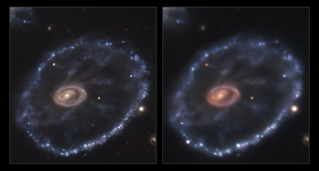 Σε απόσταση 500 εκατομμύρια έτη φωτός από την Γη, στον αστερισμό του Γλύπτη βρίσκεται ένας περίεργος γαλαξίας, γνωστός ως γαλαξίας Cartwheel. Κάποτε ήταν ένας κανονικός σπειροειδής γαλαξίας, αλλά συγκρούστηκε μετωπικά με έναν μικρότερο συνοδό γαλαξία πριν από αρκετά εκατομμύρια χρόνια, και έτσι προέκυψε το χαρακτηριστικό του σχήμα ως τροχού απ’ όπου προέκυψε και το όνομά του.