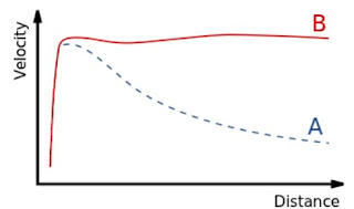Β) Ένα σοβαρό πρόβλημα όμως είναι το γεγονός ότι οι ταχύτητες καθώς πλησιάζουμε στα όρια του γαλαξία μας είναι σημαντικά μεγαλύτερες απο τις αναμενόμενες όπως βλέπουμε στο παρακάτω διάγραμμα. Η κόκκινη γραμμή είναι οι μετρούμενες ταχύτητες και οι μπλέ διακεκομένες οι αναμενόμενες αν ο γαλαξίας μας αποτελούνταν μόνο απο συνηθισμένη βαρυονική ύλη.