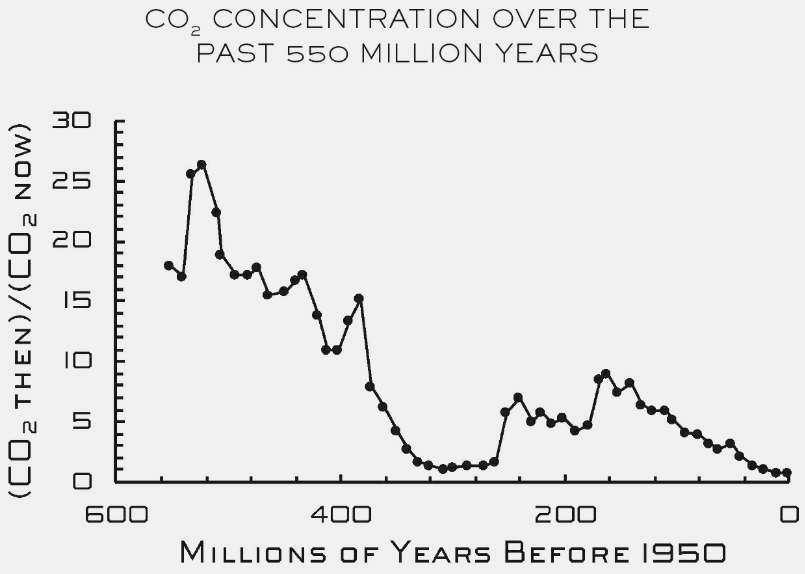 Όμως σύμφωνα με το παρακάτω διάγραμμα η συγκέντρωση του διοξειδίου του άνθρακα στην εποχή μας είναι πολύ μικρή σε σχέση με το γεωλογικό παρελθόν της Γης. Μόνο μια φορά – κατά την διάρκεια της Πέρμιας περιόδου, πριν από 300 εκατομμύρια χρόνια, τα επίπεδα του CO2 στην ατμόσφαιρα ήταν τόσο χαμηλά όσο είναι σήμερα! Η χλωρίδα και η πανίδα ήκμαζε σε περιόδους που τα επίπεδα CO2 ήταν πέντε ή δέκα φορές υψηλότερα από τα σημερινά. Τότε όμως επρόκειτο για διαφορετικά είδη φυτών και ζώων.