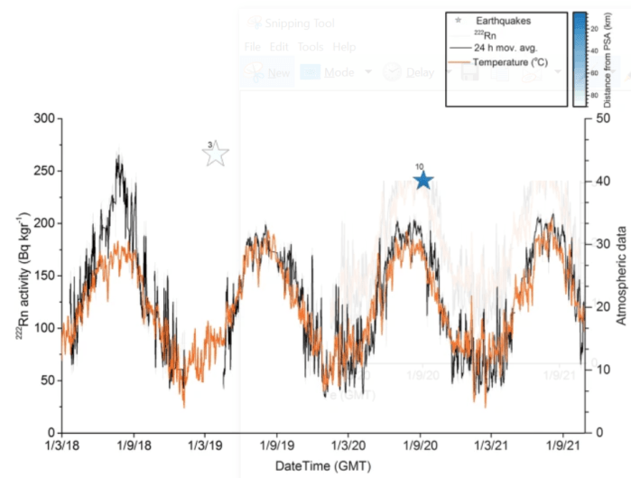 Το Εθνικό Αστεροσκοπείο Αθηνών διατηρεί την τελευταία πενταετία δίκτυο ραδιομετρικών σταθμών ακτινοβολίας-γ, οι οποίοι είναι τοποθετημένοι σε βάθος στο έδαφος, σε διάφορες θέσεις της Δυτικής Ελλάδας, των Ιονίων νήσων, του Ανατολικού Κορινθιακού κόλπου και της Κρήτης. Η νέα επιστημονική δημοσίευση περιλαμβάνει κυρίως τα αποτελέσματα που αφορούν την σεισμική ζώνη του Ανατολικού Κορινθιακού κόλπου.