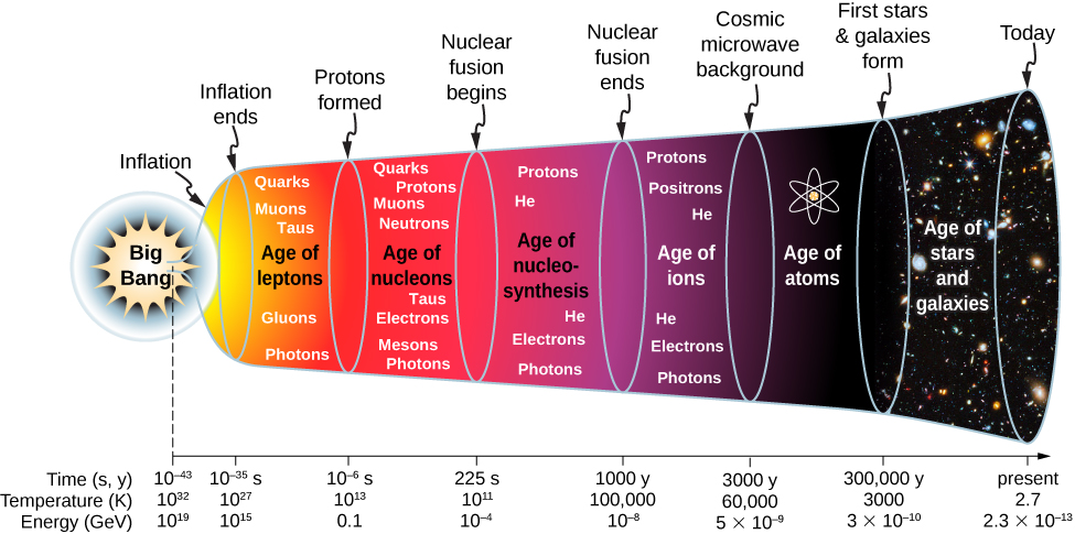 Μερικά λεπτά μετά την Μεγάλη Έκρηξη, όταν το σύμπαν ψύχθηκε τόσο ώστε να σταματήσει η πυρηνοσύνθεση, η σύσταση των στοιχείων που προέκυψε ήταν ~75% υδρογόνο (1Η), ~25% ήλιο (4He) και πολύ μικρές ποσότητες των ελαφρών στοιχείων, κυρίως δευτέριο 2Η (D), 3He και 7Li.