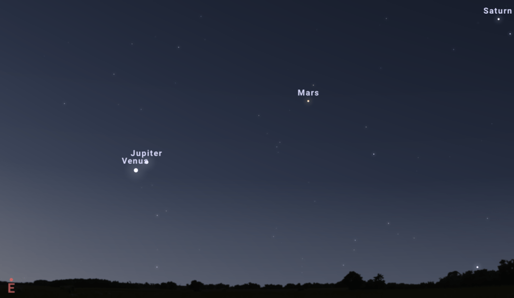 Το επόμενο πρωινό στις 2 Μαΐου 2022 και την ίδια ώρα, η απόσταση μεταξύ Αφροδίτης και Δία θα έχει αυξηθεί: