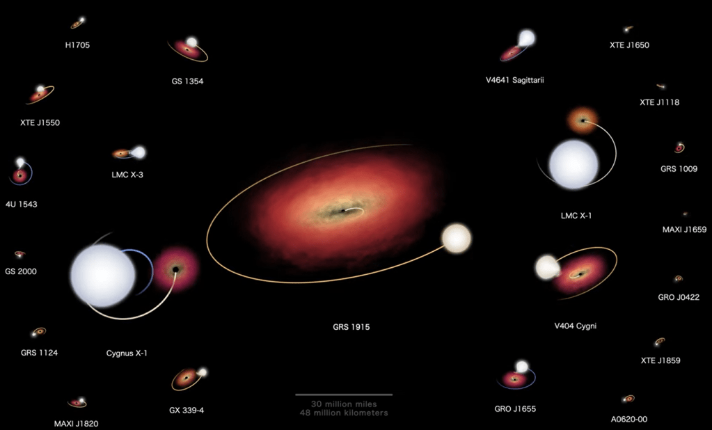 Στο βίντεο που ακολουθεί παρουσιάζονται 22 δυαδικά συστήματα ακτίνων Χ που φιλοξενούν επιβεβαιωμένες μαύρες τρύπες. Το κάθε σύστημα παρουσιάζεται όπως το βλέπουμε από τη Γη, όπου η κίνηση επιταχύνεται κατά περίπου 22.000 φορές. Τα χρώματα των άστρων που κυμαίνονται από μπλε-λευκό έως κόκκινο εκφράζουν θερμοκρασίες από 5 φορές υψηλότερες έως 45% μικρότερες από την θερμοκρασία του Ήλιου μας. Στα περισσότερα από αυτά τα συστήματα, η ροή ύλης από το άστρο σχηματίζει έναν δίσκο προσαύξησης γύρω από την μαύρη τρύπα. Οι δίσκοι προσαύξησης φαίνονται με διαφορετικό συνδυασμό χρωμάτων επειδή έχουν υψηλότερες θερμοκρασίες από τα άστρα. Οι ίδιες οι μαύρες τρύπες φαίνονται μεγαλύτερες από ότι στην πραγματικότητα χρησιμοποιώντας σφαίρες σε μια κλίμακα που αντανακλά τις μάζες τους.
