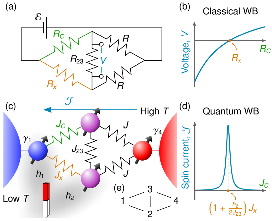 Οι ερευνητές Poulsen, Santos και Zinner στην εργασία τους με τίτλο ‘Quantum Wheatstone Bridge‘ προτείνουν μια κβαντική γέφυρα Wheatstone ως ένα πλήρως κβαντικό ανάλογο της κλασικής έκδοσης. Η μικροσκοπική γέφυρα Wheatstone βασίζεται στην αλληλεπίδραση σύζευξης σπιν που εκμεταλλεύεται τα κβαντικά φαινόμενα καταστροφικής συμβολής και σύμπλεξης. Στην δημοσίευσή τους περιλαμβάνεται το παρακάτω σχήμα που αναδεικνύει σχηματικά τις αναλογίες μεταξύ κλασικής και κβαντικής γέφυρας Wheatstone:
